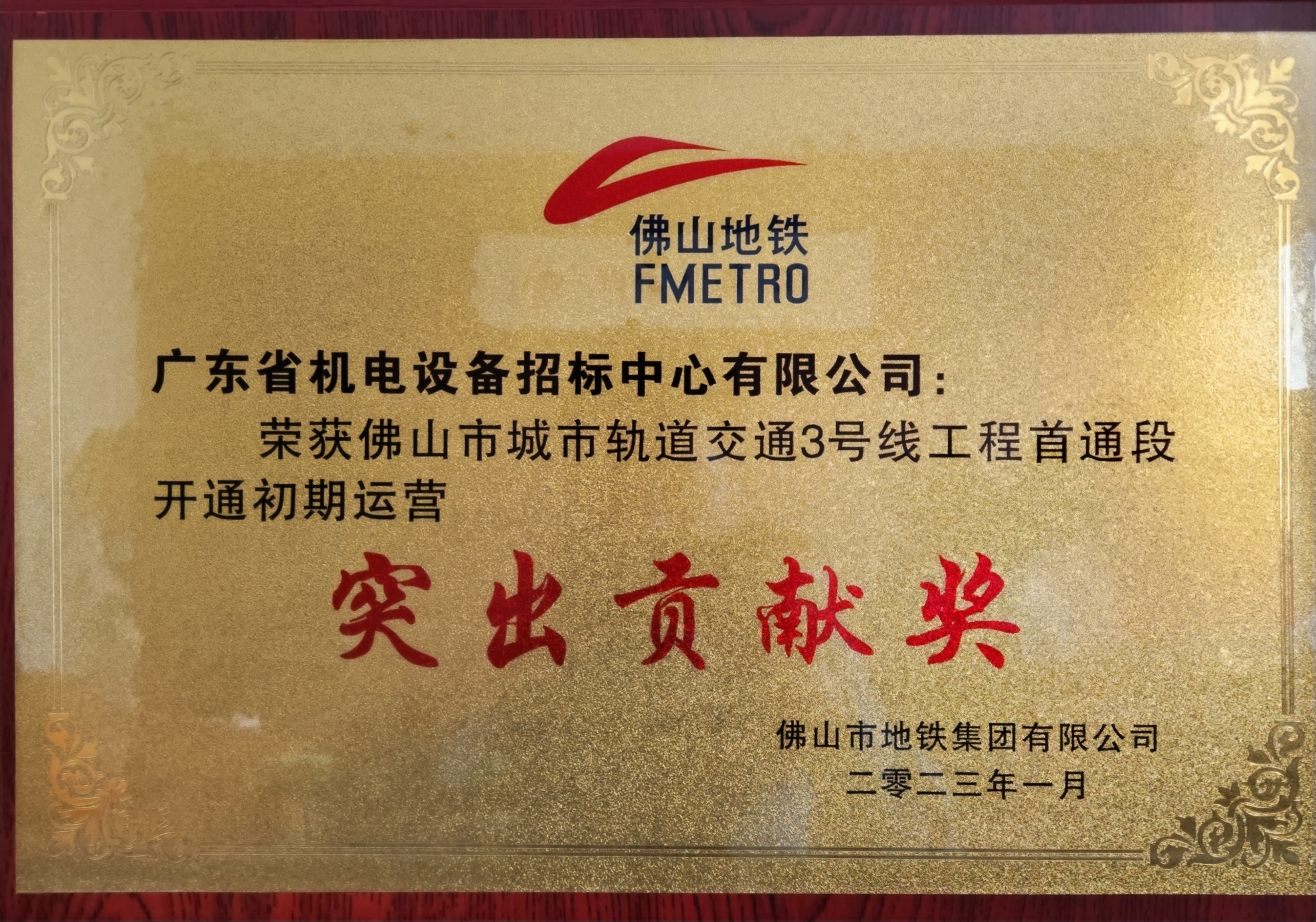 佛山市城市轨道交通3号线工程首通段开通初期运营突出贡献奖