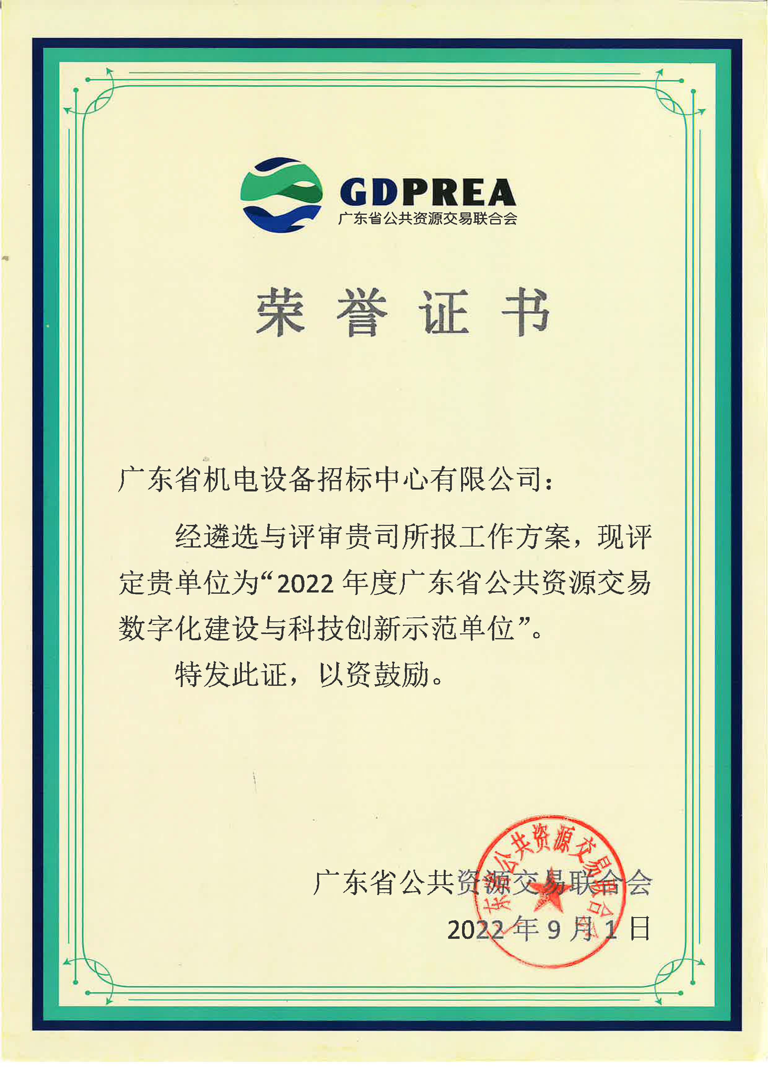 2022年度广东省公共资源交易数字化建设与科技创新示范单位荣誉证书